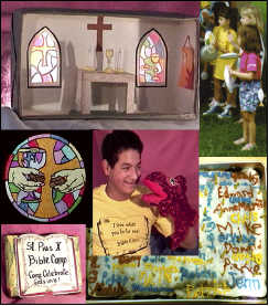 Icthus, hand puppet, presents riddles and games in the daily opening and closing circles. They also learn about a secret acronym Christians used to identify each other. The Greek word icthus is formed from the first letters of the phrase: Jesus Christ, Son of God, Savior.